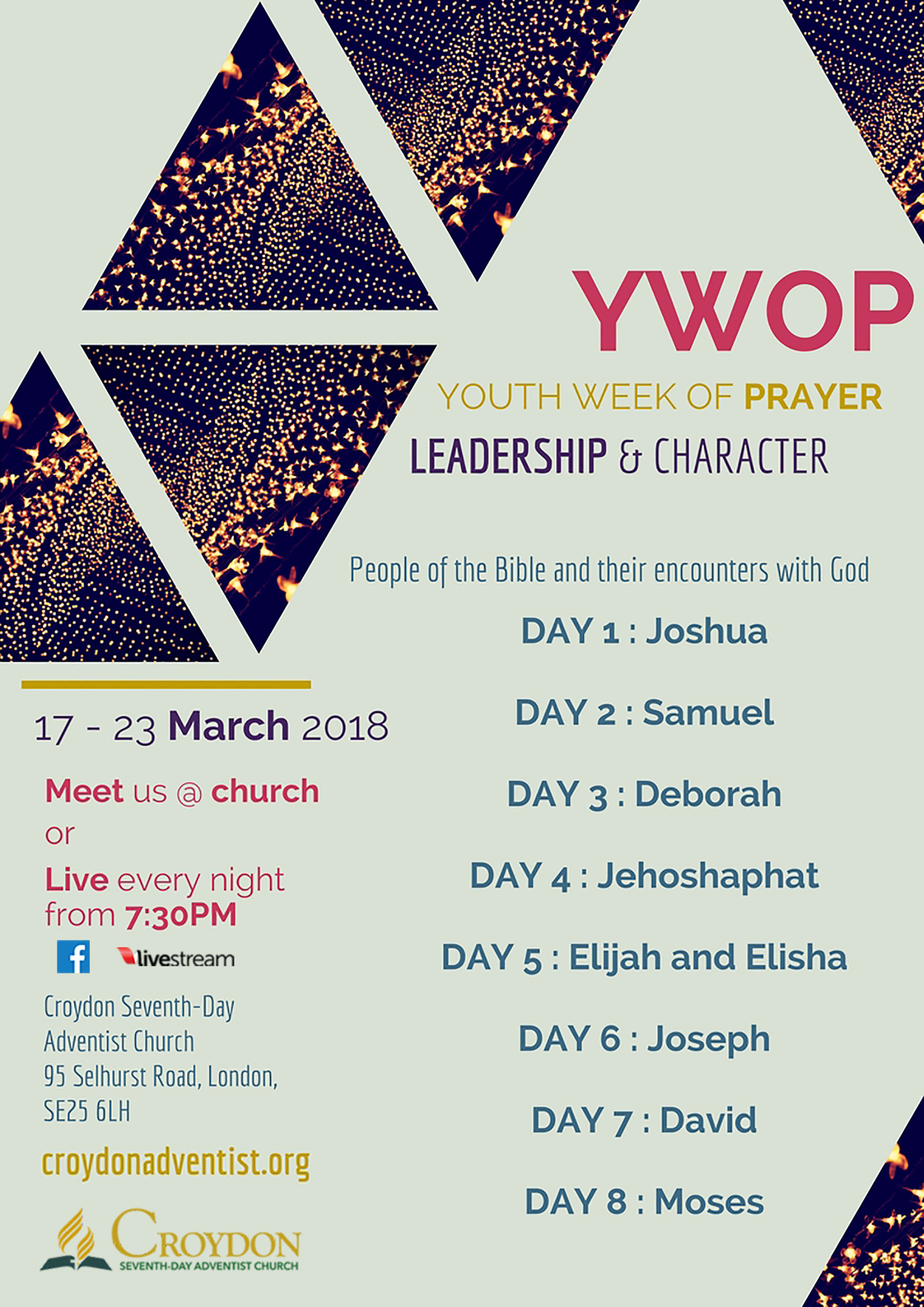 Join us each night @ 7:30pm, for Youth Week of Prayer 2018, as we spend time exploring the characters of the people God used as leaders.